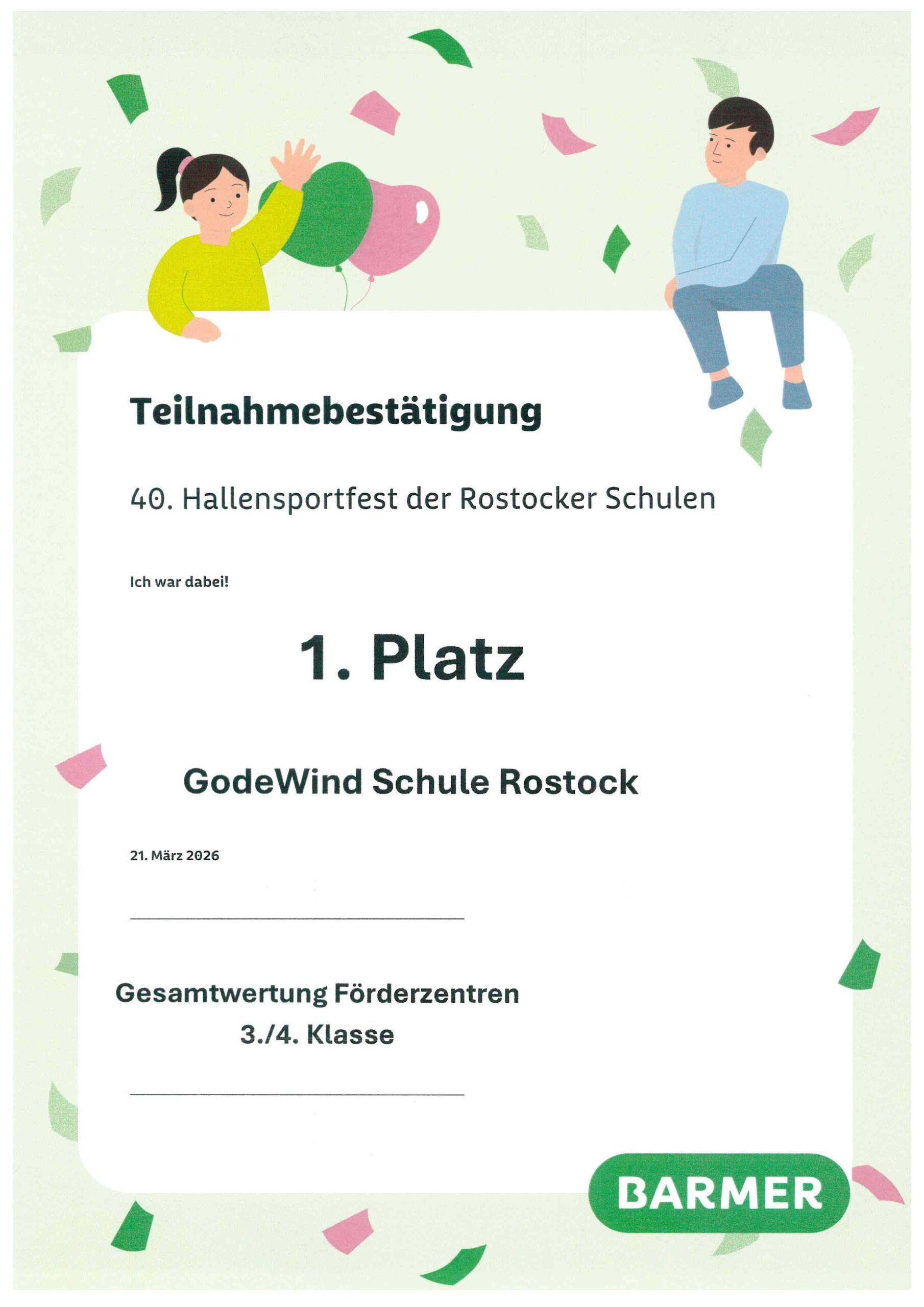 Wir möchten uns bei allen Schülerinnen und Schülern bedanken, die unsere Schule am 21.März 2026 so toll beim 40. Hallensportfest der Rostocker Schulen vertreten haben. Ein besonderer Dank geht an Frau Stohr, Frau Prahl und Herrn Both für die Unterstützung und Begleitung unserer Sportlerinnen und Sportler. Gemeinsam mit den teilnehmenden Kindern haben wir ein tolles Ergebnis erreicht und einen Gutschein im Wert von 150€ für die Jugendherbergen MV erkämpft.